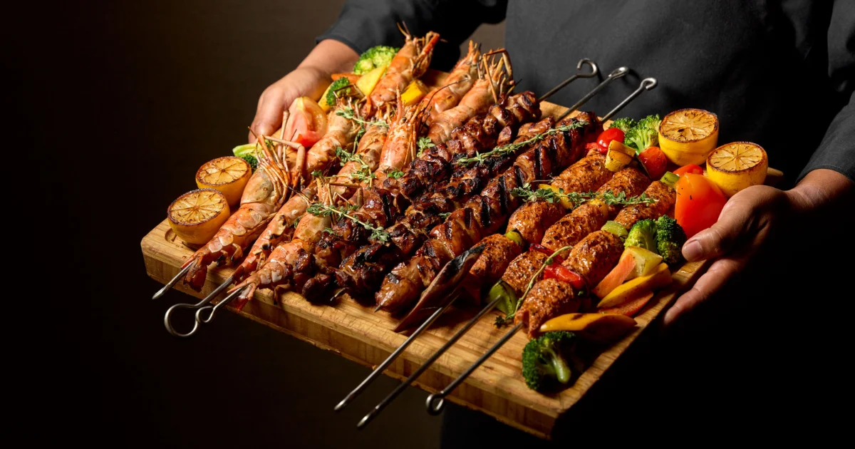Diners can look forward to a selection of premium meats such as tender beef steaks, juicy lamb cuts, and succulent chicken, all seasoned with speciality salts that enhance their natural flavours. Fresh seafood is also featured on the grill, with highlights including prawns and fish, delicately charred to smoky perfection over open flames.