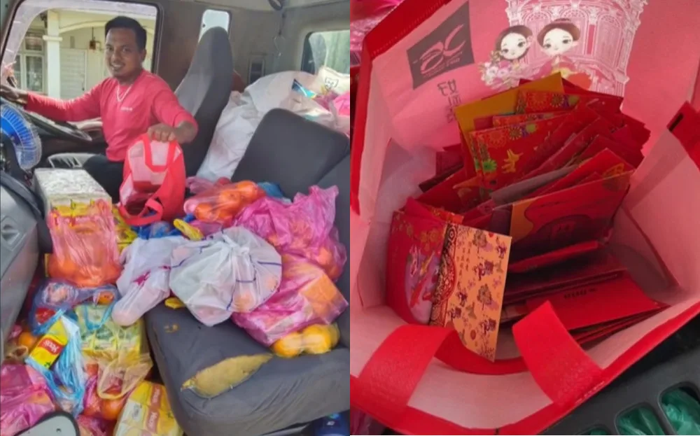 “Praise be to God for the blessings,” he captioned. “While collecting rubbish, the Chinese gave mandarin oranges, drinks and angpau.” His first video showed the generous gift they’d been given. Packs of drinks, and bags of mandarin oranges practically flooded the front seats of the truck. Additionally, they also had a bag full of red packets.