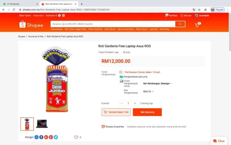 Last weekend, Twitter user Areefah Tantowi posted a screenshot of an interesting transaction on Shopee Malaysia. The seller was selling a loaf of Gardenia for RM12000 with the inclusion of a “free” Asus ROG laptop.