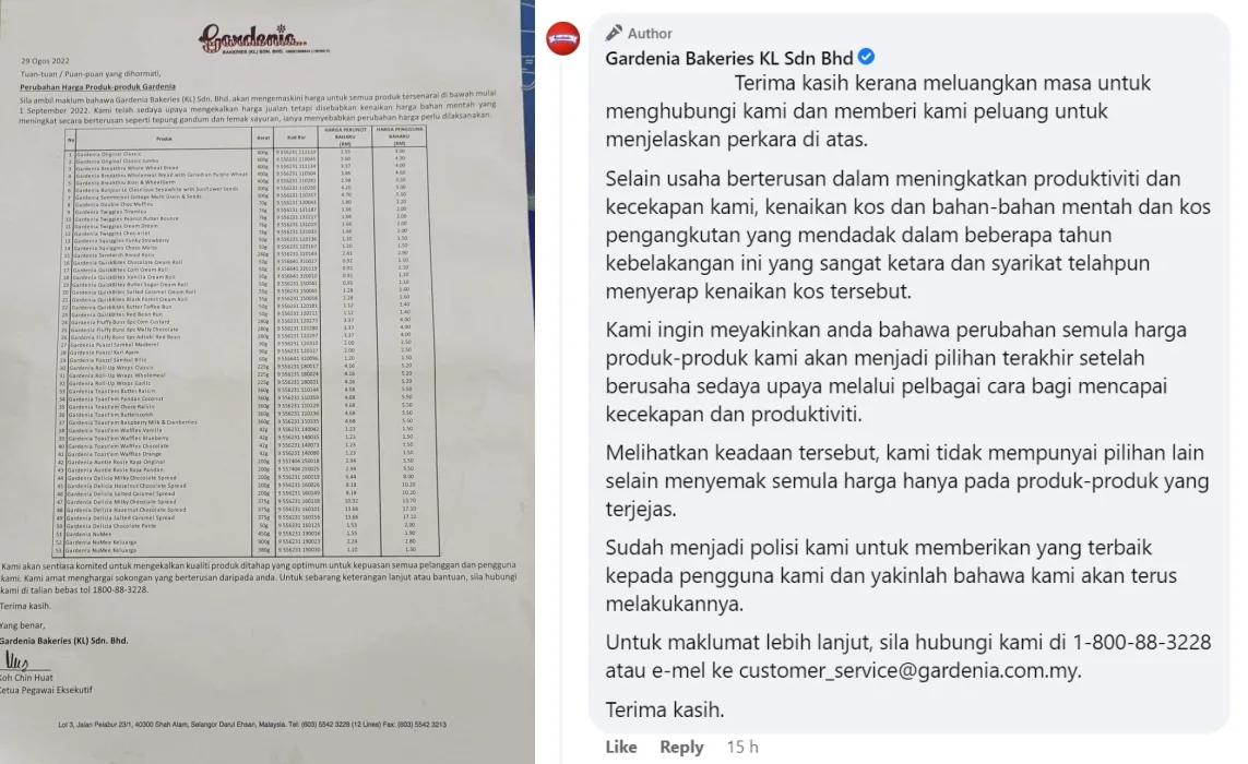 Recently, a notification letter from Gardenia Bakeries (KL) Sdn Bhd (Gardenia KL) regarding the price adjustment of their products has gone viral. It contains the new price list of their products addressed to the retailers. Gardenia KL has also confirmed that the new price of their baked products will be effective starting this 1st September.