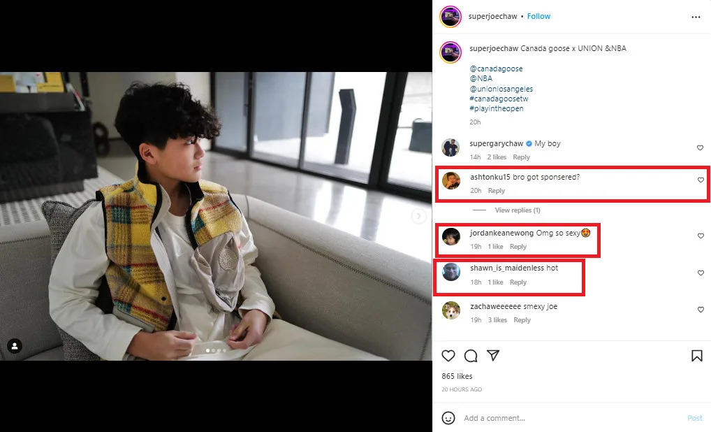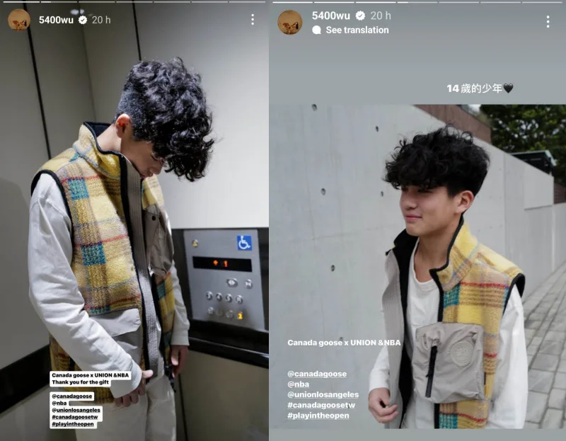 However, notably enough, Joe tagged two clothing brands in his post: Canada Goose and Union Los Angeles. As it turned out, the plaid vest was part of their NBA collection. Joe’s mom, Wu Suling (吳速玲) also reposted his photos, thanking the brands for “the gift”.