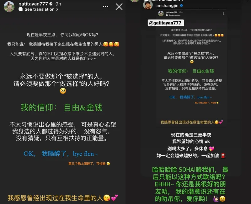Her Instagram Story attracted attention, including ex-lover Shang Jin, He was quick to remind her to drink less and rest more. “You will definitely improve,” he told her. “Let’s do it together.” Gatita laughed and jokingly asked, “Is this the only way we have to communicate?” She reminded Shang Jin that she still cares for him. “You are still my good friend,” she stated.