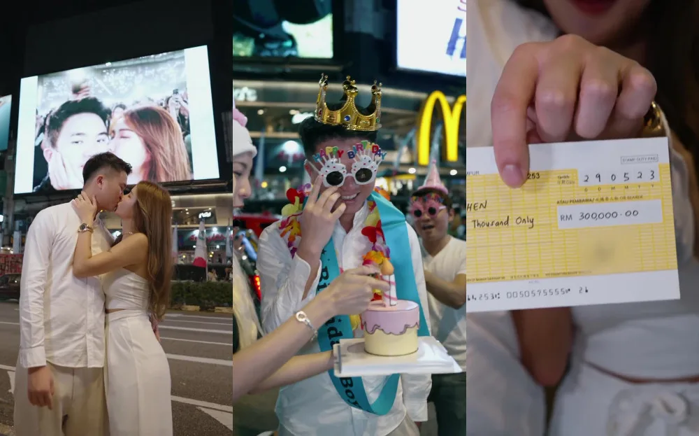 However, the billboard video wasn’t the only surprise Gatita had planned for Wee Shen. After he blew out the candle on his cake, Gatita nervously presented him with a small box. Upon opening it, Wee Shen was amazed to discover a cheque for RM300,000 inside. “For someone who has everything, I didn’t know what to gift you,” she admitted. “So I paid (you) with a cheque. I love you!”