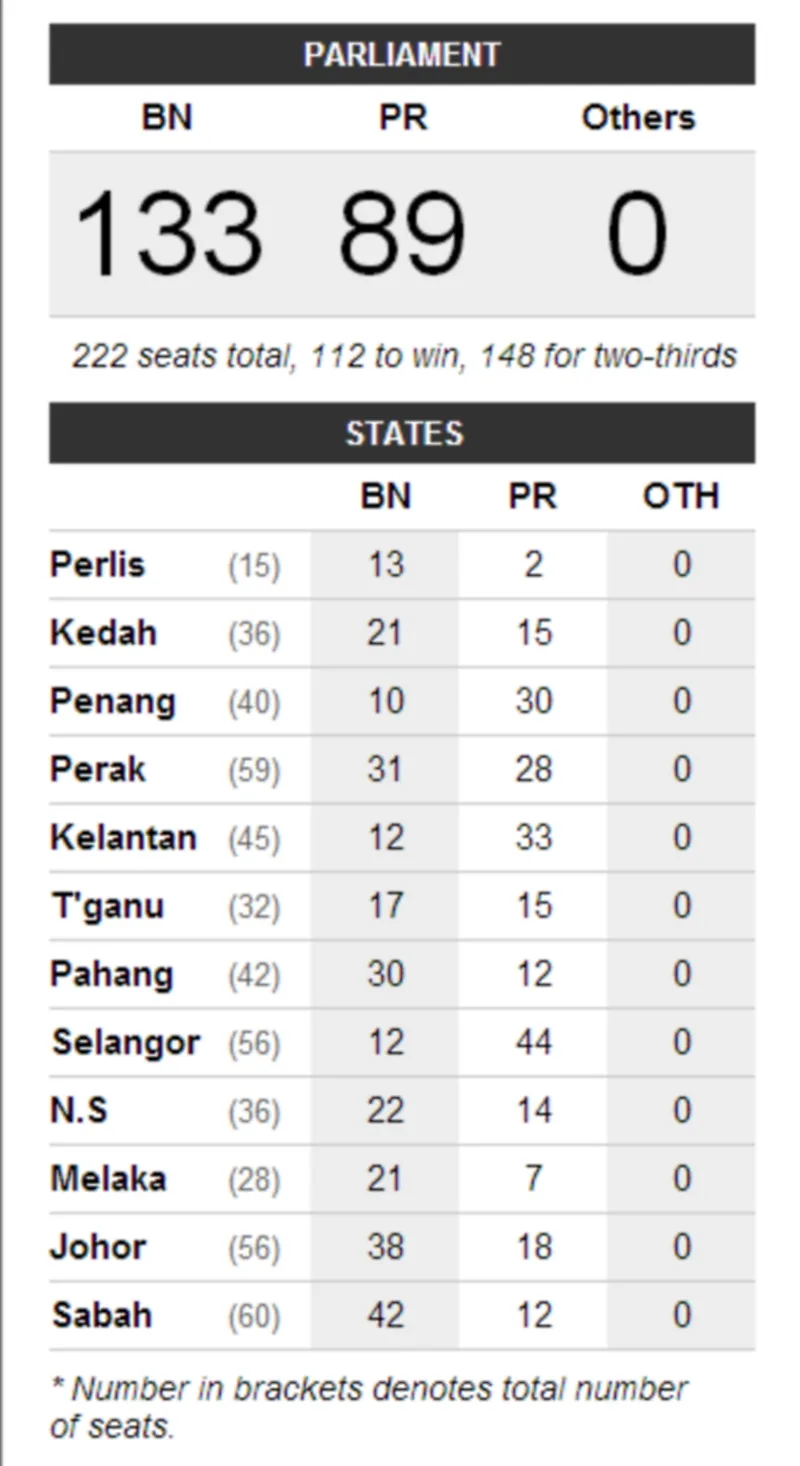 5) The final tally is BN – 133, Pakatan Rakyat – 89. Pakatan scores a net gain of seven seats. BN forms the next Malaysian government, but still denied two-thirds of Parliament seats.