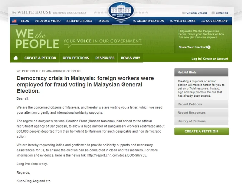 Filed under Foreign Policy, Human Rights, Labor, a Malaysian has sent in a petition to the White House, seeking urgent attention regarding “democracy crisis in Malaysia”. The concern, as stated in the petition, is primarily focused on foreign workers that were employed for fraud voting in the 13th Malaysian general election.