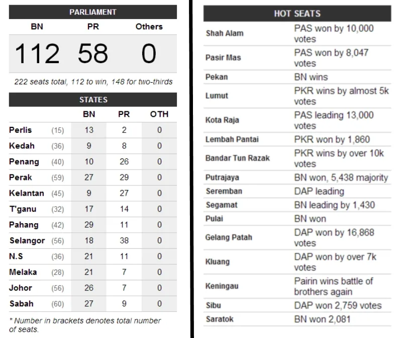 For those of you who’ve stayed up this long to await the news from the polls, we applaud you. As of 12:50am, these were the results from the 13th Malaysian general election: