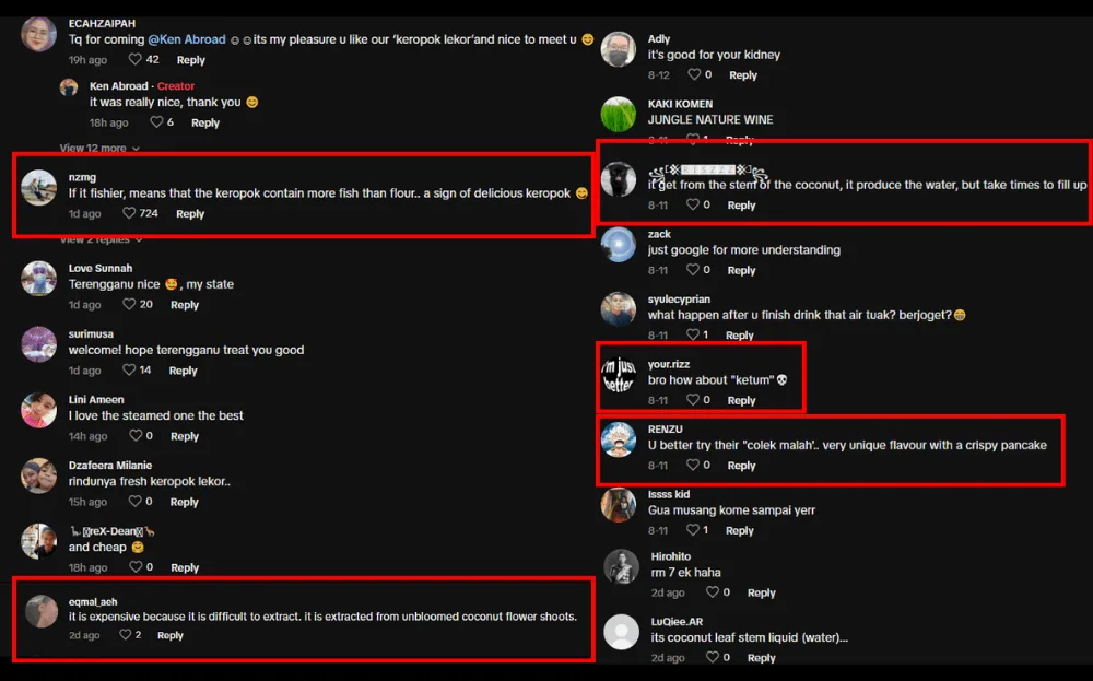 In the comments of the videos, many locals shared their reactions to the traveller’s food reviews. Some provided more explanation and context for the food, like one comment that said that fishier keropok lekor meant more fish meat was in the dough. A few locals also urged Ken to try other local specialities like air ketum and colek malah.