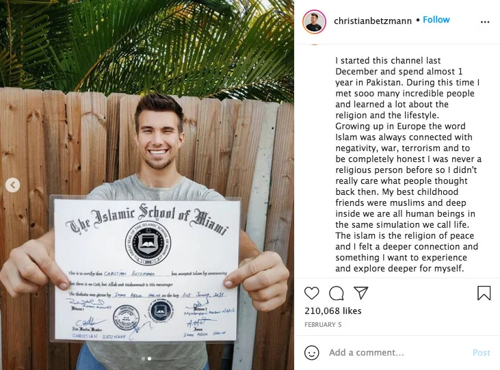 In addition, Christian also took to his Instagram to personally announce the good news with his followers, accompanied with a few photos of him with his certificate of confirmation from the Islamic School of Miami. “I started this channel last December and spend almost 1 year in Pakistan. During this time, I met sooo many incredible people and learned a lot about the religion and the lifestyle,” the vlogger wrote on the caption.