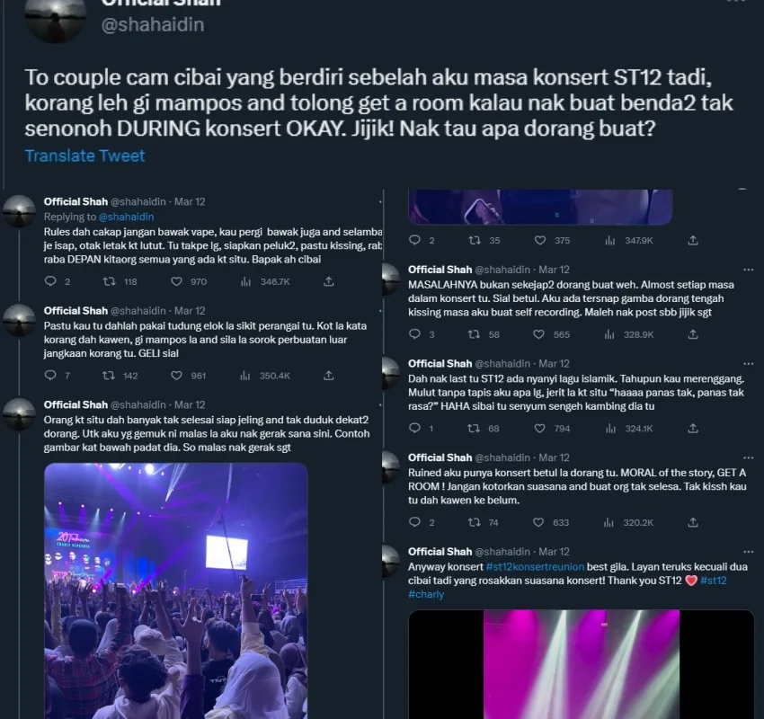 Over the weekend, Twitter user @shahaidin or Shah tweeted his experience of attending the recent ST12 Reunion concert in Kuala Lumpur on Saturday (11th March). The netizen, unfortunately, did not enjoy the Indonesian rock band’s show because of some serious PDA action by a couple who was standing to his left. “If you want to act indecently, please get a room and not do it during a concert okay? Disgusting!” he tweeted.