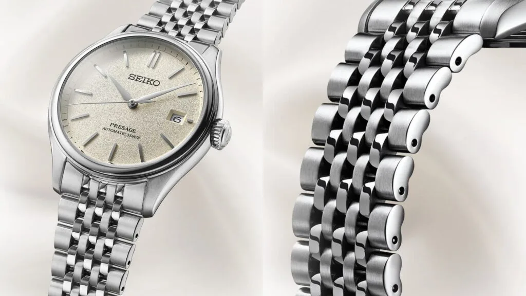 A newly developed multi-row bracelet with design inspiration from the 1970s provides a delicate and comfortable feeling on the wrist. The bracelet’s links have an ergonomic shape, with a curved top surface and a reduction of contact points around the wrist for a comfortable fit and enhanced aesthetics.