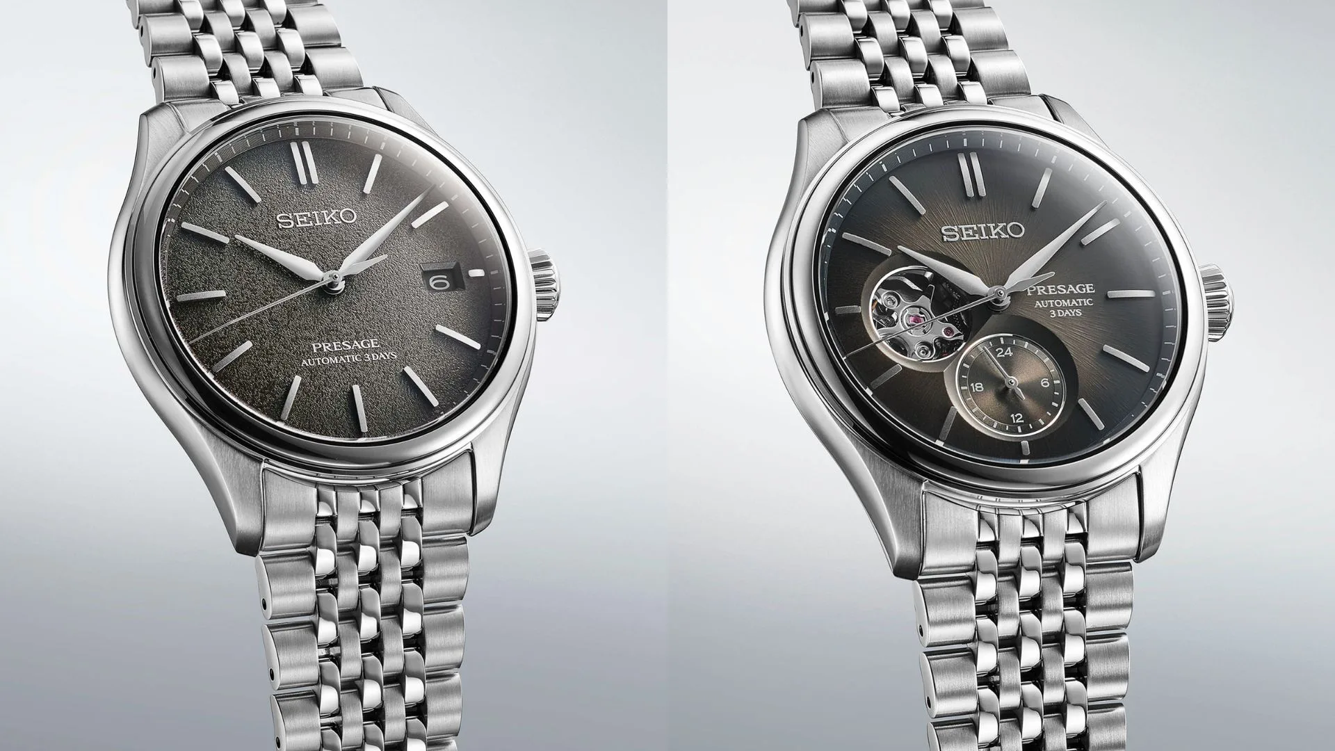 Three of the watches have the classic three-hand configuration with central seconds and date, while the remaining two bear a 24-hour scale and a dial opening onto the movement’s escapement at 9 o’clock. Powering each new watch is one of two recently introduced Seiko 6R movements that run for 72 hours, ensuring that a watch removed Friday evening will be ready to wear on Monday morning without having to be reset. The three-hand watches with date use Calibre 6R55, while Calibre 6R5J powers the open-heart watches. Each movement’s gold-coloured oscillating weight is visible through an exhibition case back.