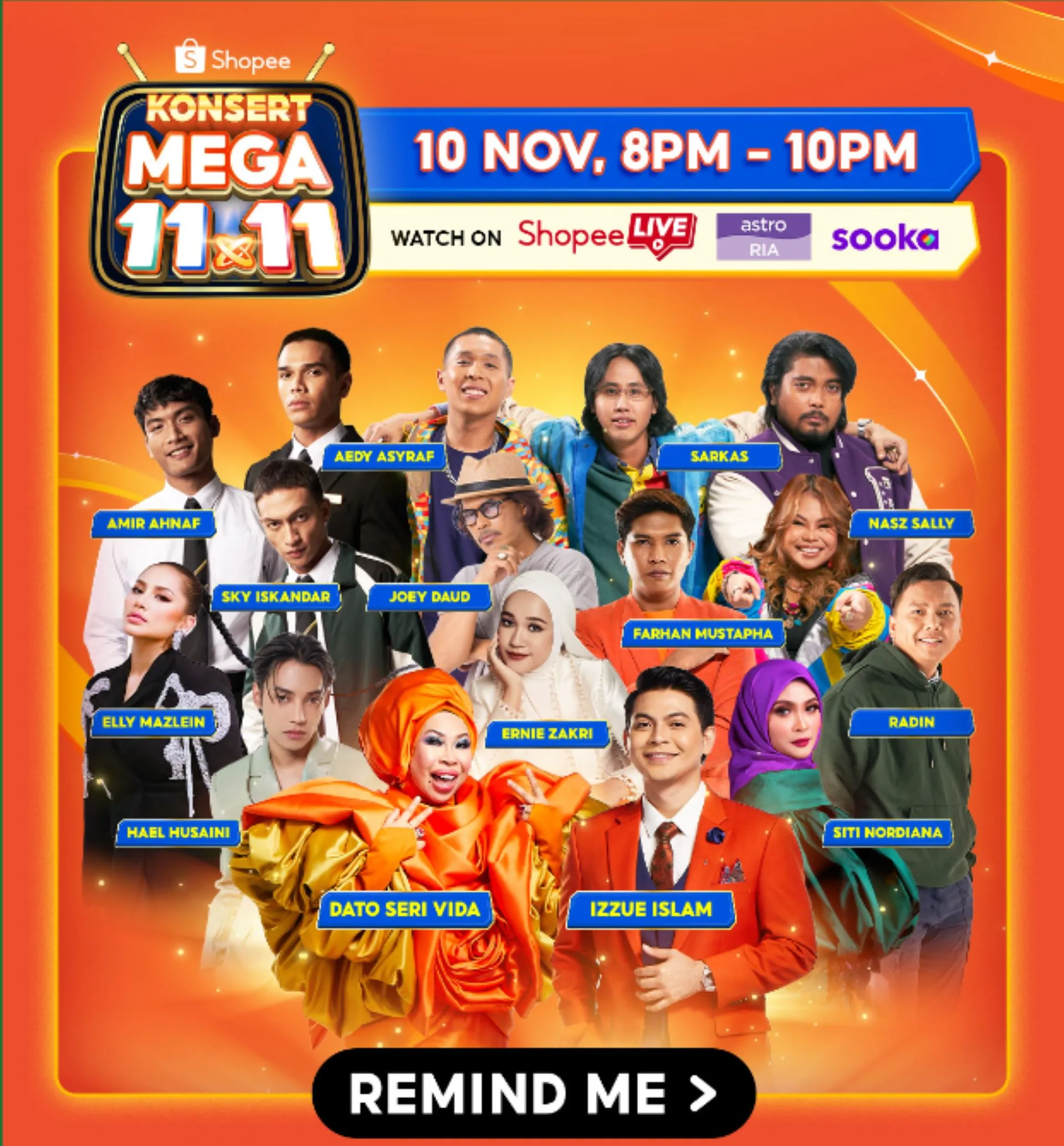 Set a reminder for an unforgettable night on 10th November at 8pm! Get ready to join the biggest excitement at the “Shopee Konsert Mega 11.11” on Shopee Live, Astro Ria & Sooka App! Prepare for a spectacular evening filled with dazzling performances and hilarious sketches from your favorite celebrities such as: Elly Mazlein, Radin Era, Farhan Mustapha, Sarkas (Acap S, Shashic & Danial), Nasz Sally, Joey Daud, Siti Nordiana, Hael Husaini, Ernie Zakri, Dato Seri Vida, Izzue Islam, Kahar Boys (Aedy Asyraf, Amir Ahnaf, & Sky Iskandar)!