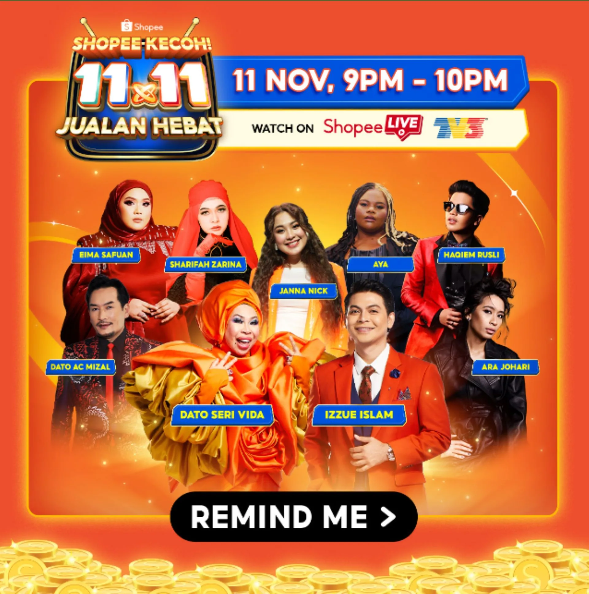 Mark your calendars for 11th November at 9pm! It’s time to join the festivities and tune in to the “Shopee Kecoh! 11.11 Jualan Hebat” show on Shopee Live and TV3! Get ready to be entertained with spectacular performances and hilarious sketches by top celebrities such as: Izzue Islam, Janna Nick, Dato’ AC Mizal, Dato Seri Vida, Eima Safuan, Sharifah Zarina, Ara Johari, Aya Amiruddin, Haqiem Rusli and more! Plus, don’t forget to seize exclusive deals and win prizes during the TV Show (11th November, 9pm).