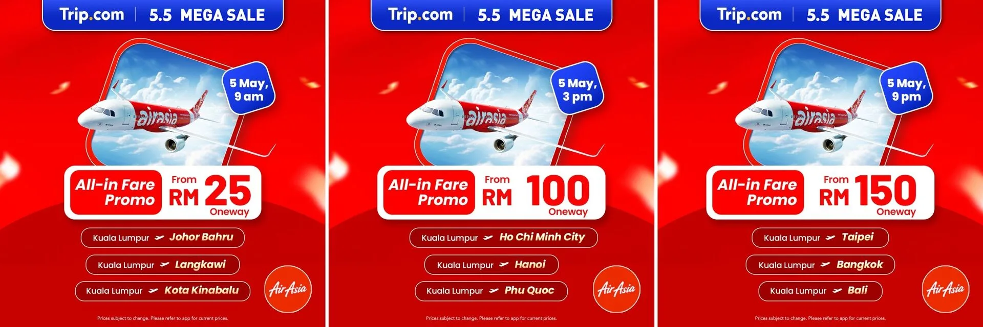 Book discounted one-way all-in fares from RM25 with AirAsia, including: