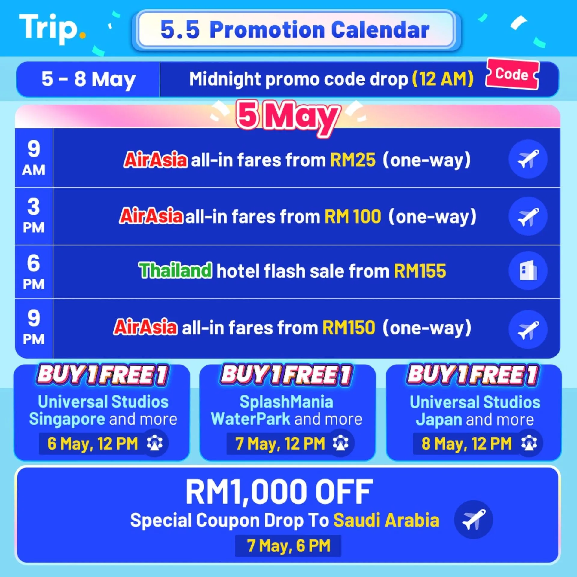 From 6th May onwards, Trip.com rolls out Buy 1 Get 1 Free attraction deals across popular destinations like Singapore, Desaru Coast, Langkawi, Japan and Bali. Travellers can also enjoy up to 50% off massages, e-sims, airport fast-track services, and more.