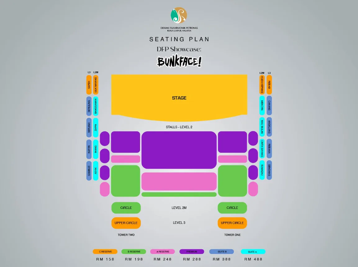 Ticket prices are: Premium RM288; A Reserve RM248; B Reserve RM198; and C Reserve RM158. For a more luxurious experience, suite tickets are available at RM388/RM488 per seat, including light refreshments.