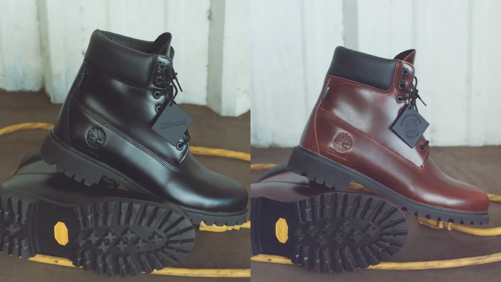 The black and brown colour options both have a grain leather finish, and the JJJJound and Timberland Tree logos are visible at the heel.
