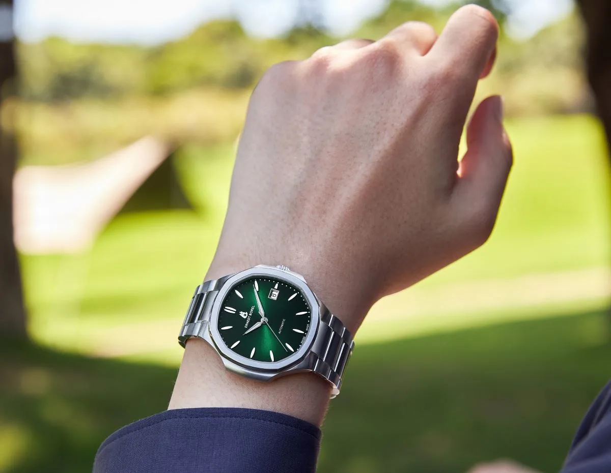 Another watch in the series features a green leather strap paired with a green, gradient spark-patterned dial, presenting a contemporary and bold design that gives the timepiece remarkable artistic tension and collectible value. The Sage collection embraces self discovery and the limitless possibilities of the world.