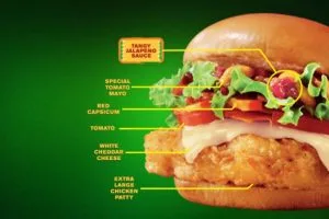 The mouthwatering burger features an extra-large crispy chicken patty, layered with a creamy white cheddar cheese slice, red capsicum, lettuce, and tomatoes, topped with tangy Jalepeno sauce and special tomato mayo, all sandwiched between a shiny glazed bun.