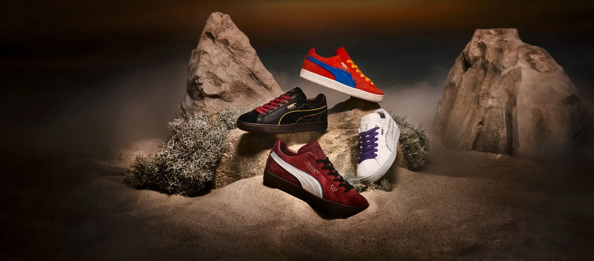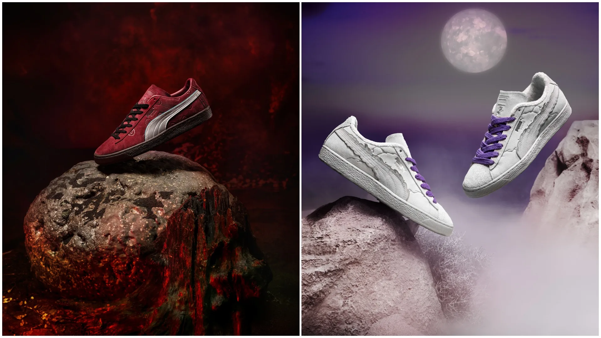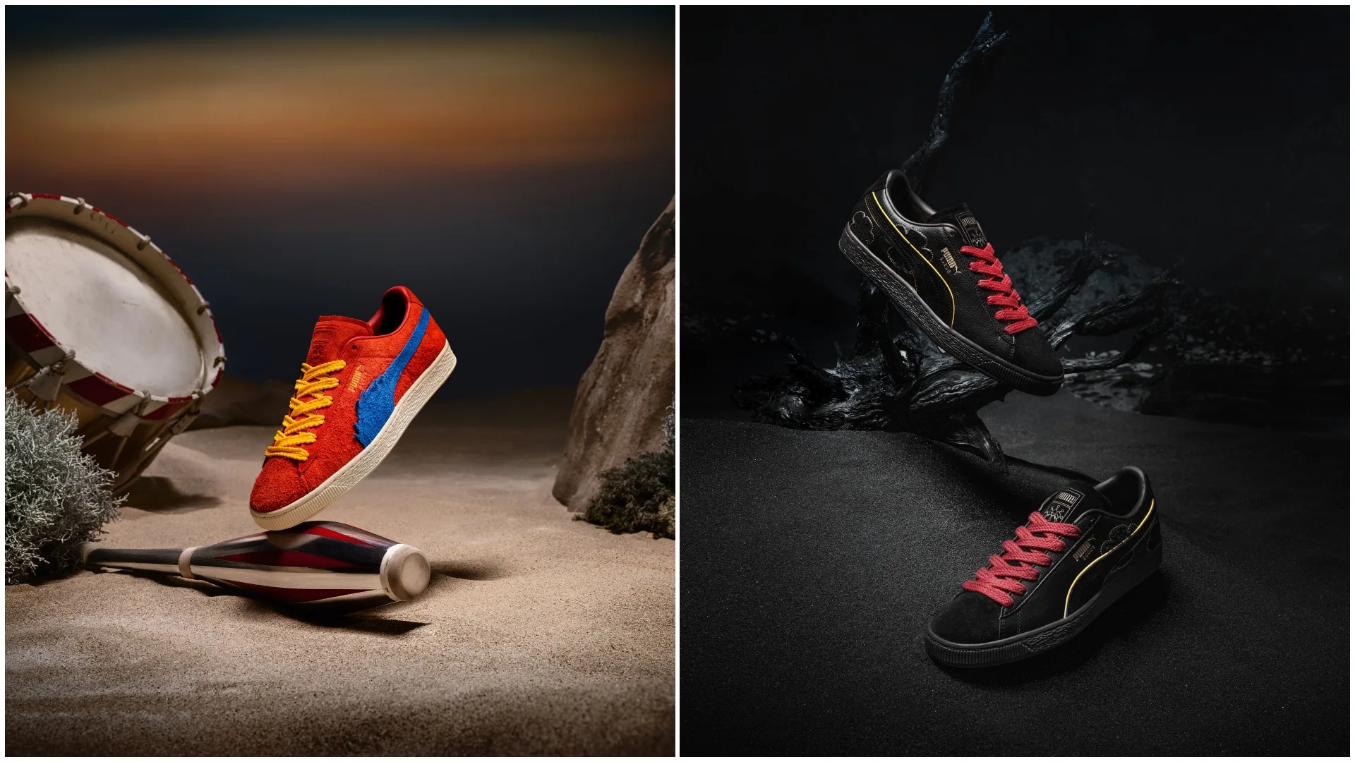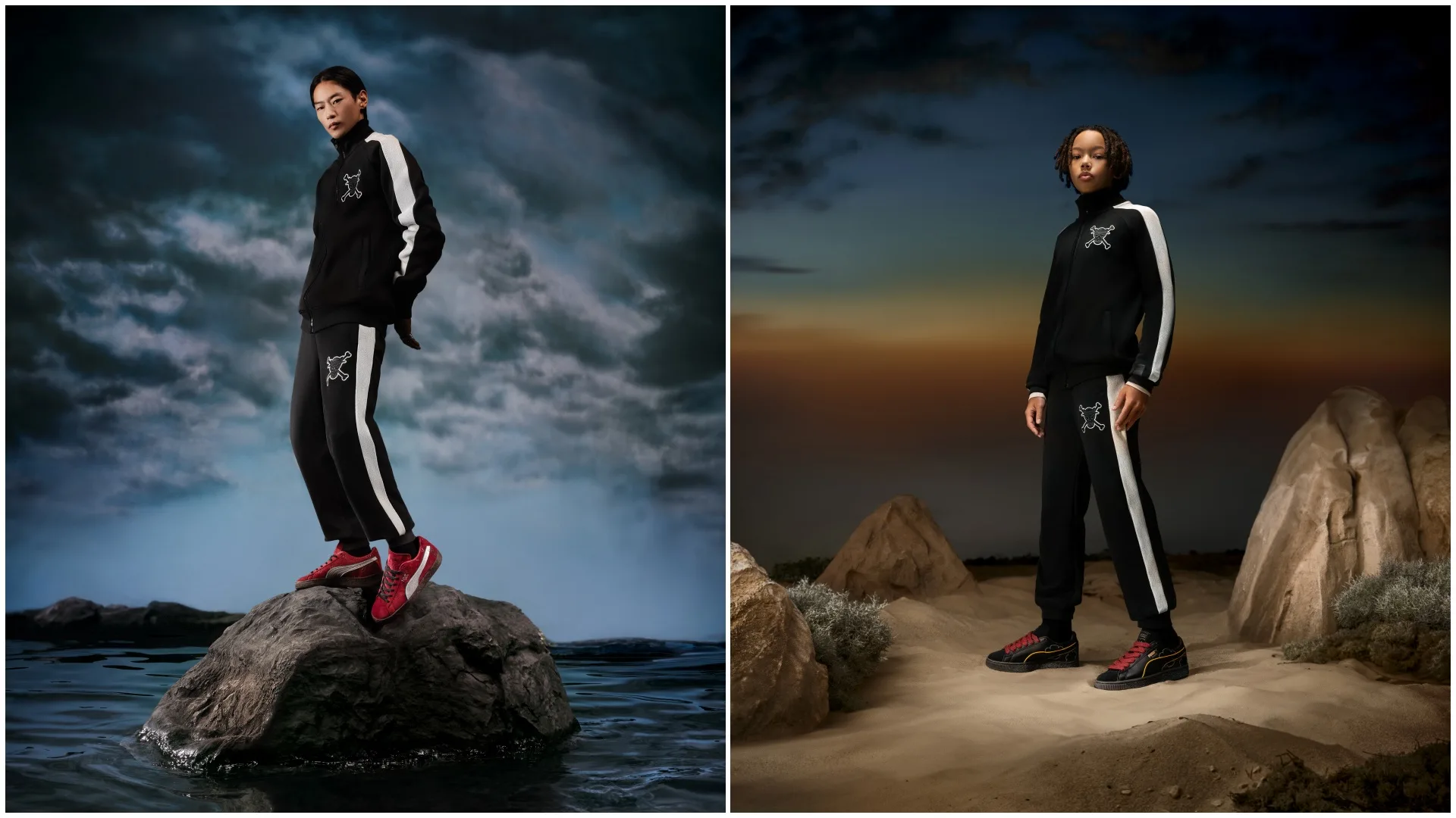 For footwear, the collection’s four expressive PUMA Suedes are inspired by the Four Emperors: Straw Hat Luffy, Red-Haired Shanks, Blackbeard Teech, and Buggy the Genius Jester. Each of these figures is alluded to through elevated detailing like a cloud-shaped Formstrip representing Gear5 Luffy and scar-mark embroidery nodding to Shanks.