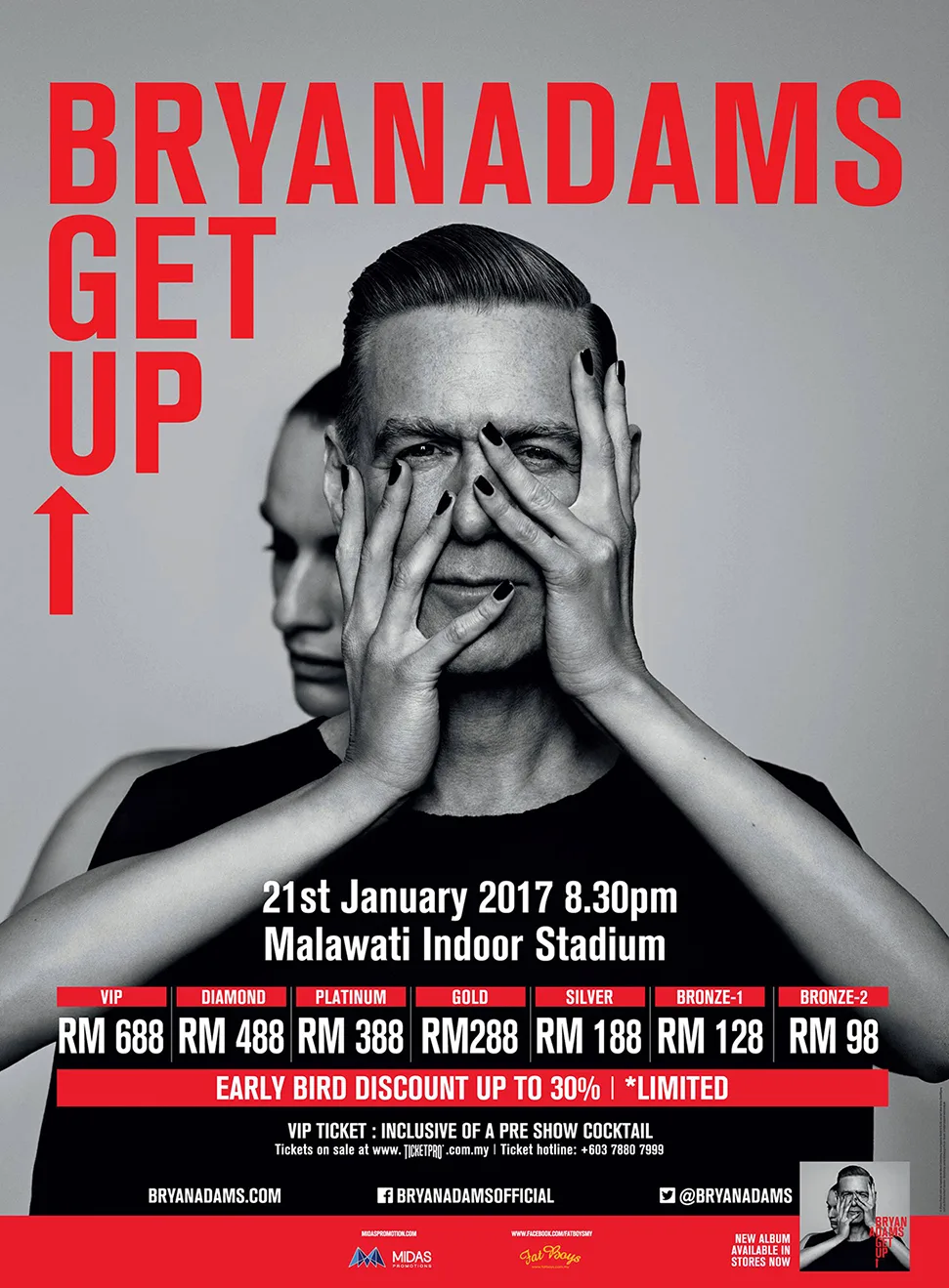 Brought to you by Fat Boys Malaysia and Midas Promotions, the details for Bryan Adams’ “Get Up Live in Malaysia” are as follows: