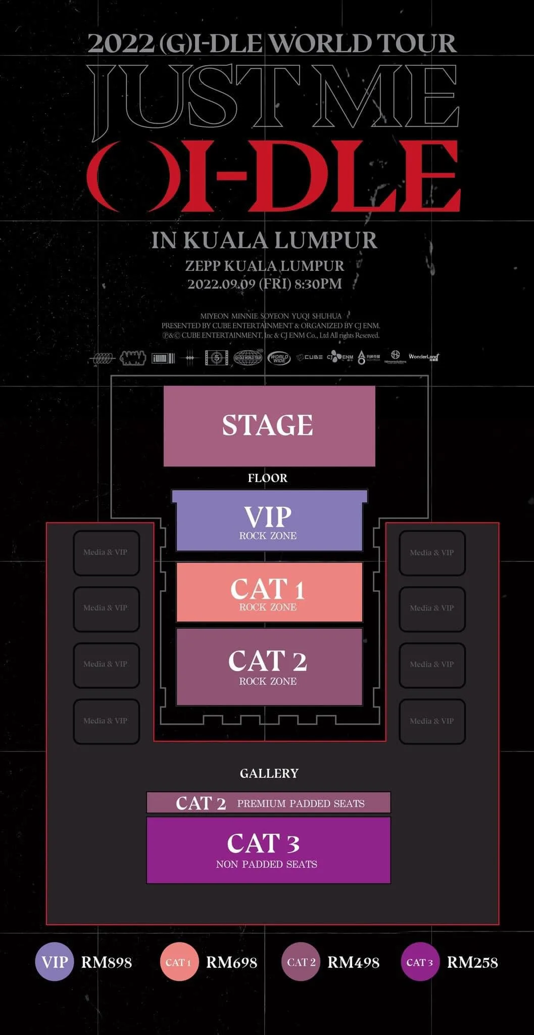Take note Neverlands (as fans are lovingly called), the concert ticket prices for (G)I-DLE Live in Kuala Lumpur have been announced. Presale tickets will go live on 16th July, while general sale will go live the following day, on 17th July via ticket2u.com.my. For those curious, here’s the seating plan:
