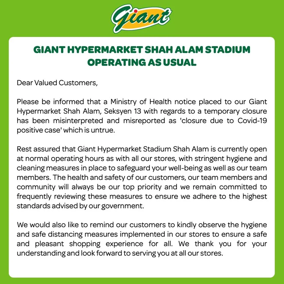 Giant Malaysia has since release a statement, saying that the notice at the Shah Alam branch is not related to Covid-19.