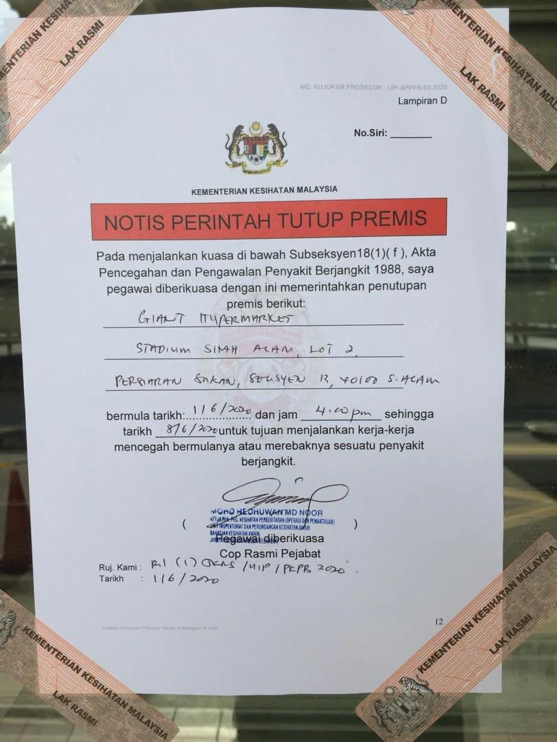 Among the SOP issued include practicing social distancing, limiting the amount of people in the premise at one go, and taking visitors’ body temperature. The notice (pictured above) stated the closure of Giant hypermarket is in accordance to Subsection 18(1) (f) of the Prevention and Control of Infectious Diseases Act 1988.
