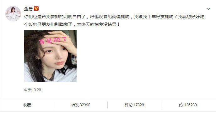 The actress herself responded to the overwhelming discussions on Weibo. “You helped me arrange everything clearly. (You) saw nothing but said I kissed,” Jin wrote. The actress sarcastically asked if they thought she would kiss her friend of ten years. “I just want to have a good meal,” she lamented. “Paparazzi friends don’t (follow) me!” Jin also added a photo of herself with the phrase “really drunk” written over it. So far, the post has garnered over 130,000 likes.