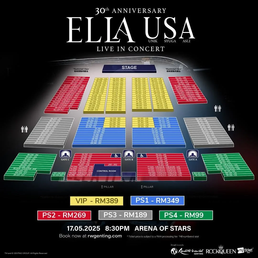 - Ticketing: RM389 (VIP), RM349 (PS1), RM269 (PS2), RM189 (PS3) RM99 (PS4)