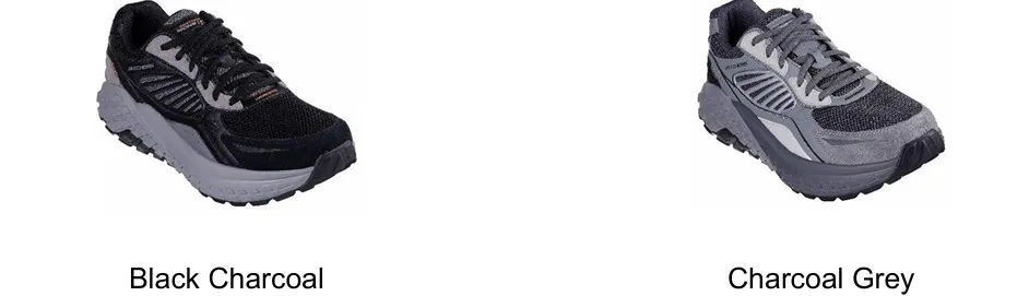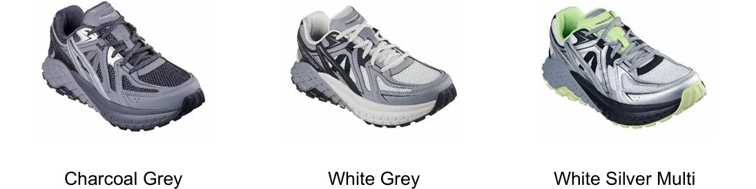 The men’s lineup includes two distinct models with bold colour options: the sculpted Skechers Monster Evo in White Grey, White Silver Multi, and Charcoal Grey, and the Monster Evo – Calivur offered in Black Charcoal, and Charcoal Grey.