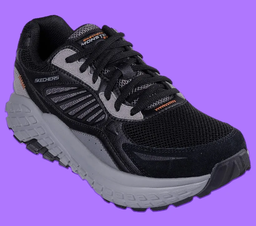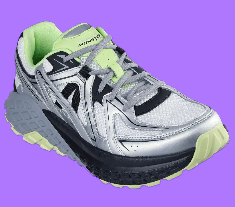 The Skechers Monster Evo for men stands out with its dynamic layered upper, synthetic mesh, and sharp overlays in three tonal shades. Its exaggerated outsole, sculpted with wave-like grooves and bold edge contouring, delivers an unmistakably modern sporty profile that turns heads while supporting all-day movement.