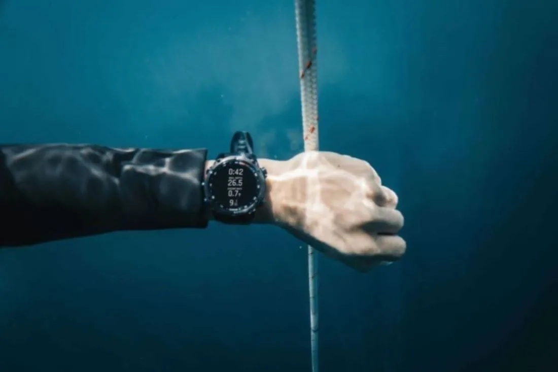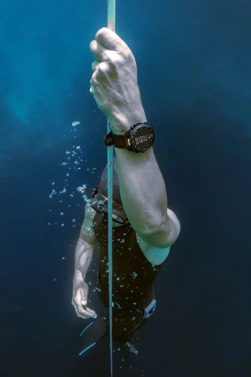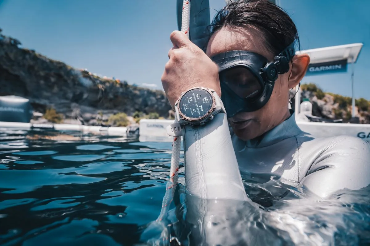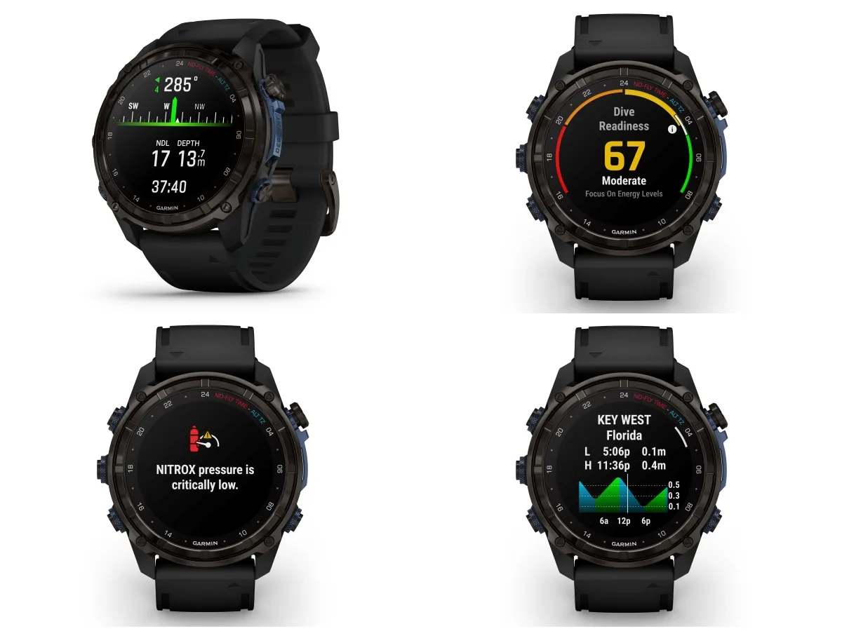 Built-in sensors – like an altimeter, barometer, compass and even an underwater compass – help navigate a dive and surface GPS helps track entry and exit points on the surface. Divers can also use the variometer tool to monitor their freedive descent and ascent rates through tone and vibration feedback. Before diving in, users can check nearby tide conditions from their watch and use the reference point tool for surface navigation to a target dive site. Following a dive, the dive log lets users review data, track gear, take notes and share details via the Garmin Dive smartphone app.
