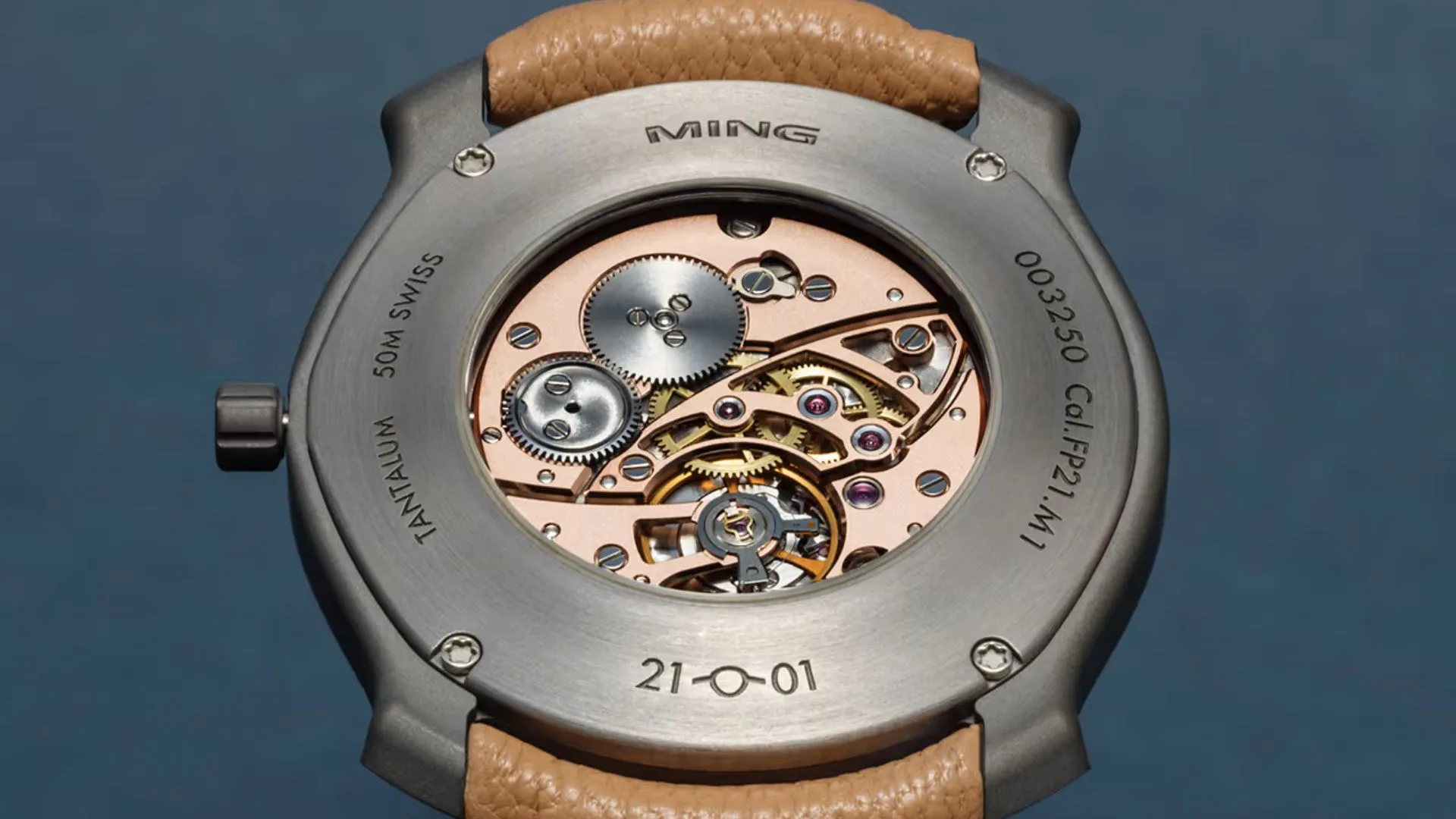 This vintage movement is housed inside a 35mm monobloc case, crafted from tantalum — a highly corrosion-resistant metal with a high melting point that’s notoriously known to be incredibly difficult to machine.