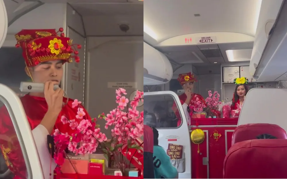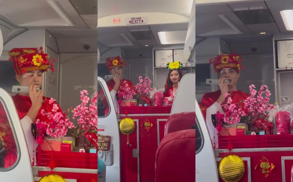 The video showed an air steward dressed in a “God of Wealth” costume, making announcements about AirAsia’s ongoing promotions. His unexpected appearance excited many passengers and several were quick to whip out their phones to record the scene.