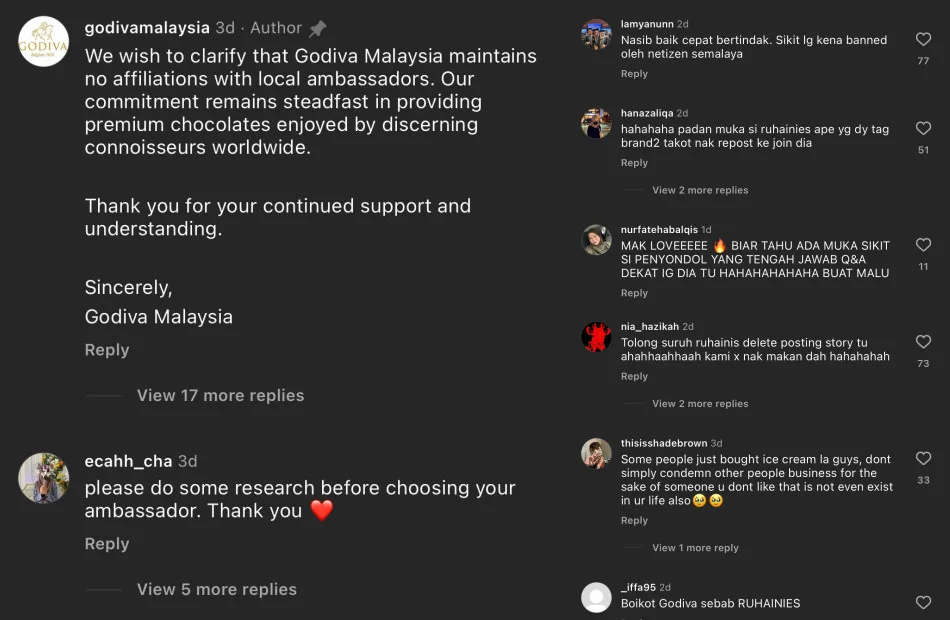 However, the brand denied ever collaborating with the star or any local ambassador. Godiva even posted an Instagram post afterwards to clarify the rumours after it went viral. Netizens got their prompt clarification; there’s even a netizen who requested Ruhainies to delete her Instagram story that tagged the brand or they will boycott the brand.