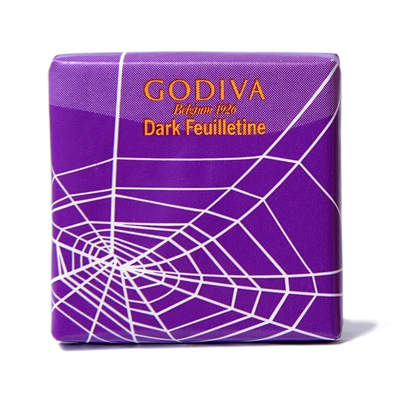 Rich dark chocolate and the crunchy feuilletine matches extremely well for a delicate and crisp texture that gently embraces your taste buds. The spooky spider web on the purple packaging makes the carré more lovable than ever.