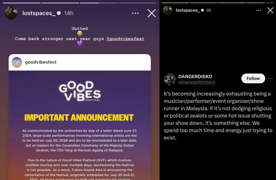 Malaysian singer lost spaces expressed that he is gutted to hear the news about the cancellation. Apart from reposting the event’s announcement post, he also shared a screenshot of a Tweet by fellow musician DANGERDISKO that reads, “It’s becoming increasingly exhausting being a musician/performer/event organiser/showrunner in Malaysia. If it’s not dodging religious or political zealots or some hot issue shutting your showdown, it’s something else. We spend too much time and energy just trying to exist.”