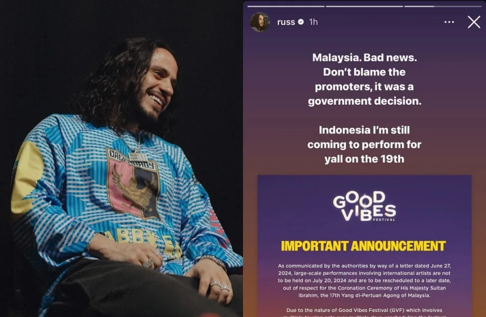 American singer-rapper Russ, who was supposed to perform on Day 1 of GVF, took the time to let his fans know that his upcoming performance in Malaysia is cancelled. Taking to Instagram, the “HANDSOMER” artist urged his disappointed audience not to blame the event’s organisers and promoters as the cancellation was out of their control.