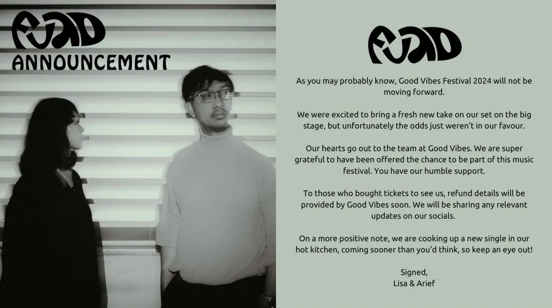 Siblings Lisa and Arief tweeted the announcement about the cancellation. In their post, although the duo is disappointed to hear the news, they thanked the GVF team for giving them the opportunity to be featured as one of the lineups for this year’s (now-cancelled) event.