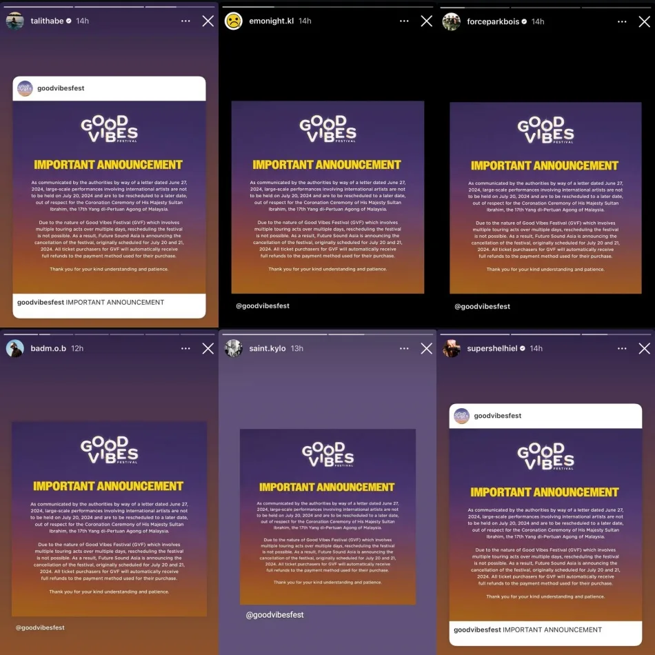 Some local and international acts didn’t say much about the cancellation but they did, however, share GVF’s announcement post on their Instagram Stories to deliver the bad news to their respective fans.