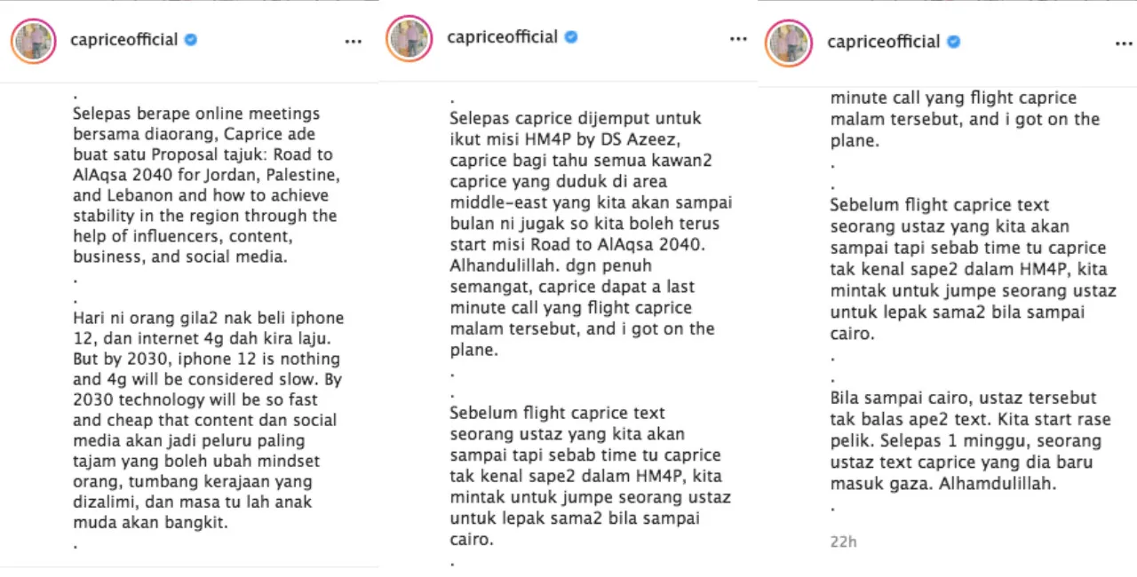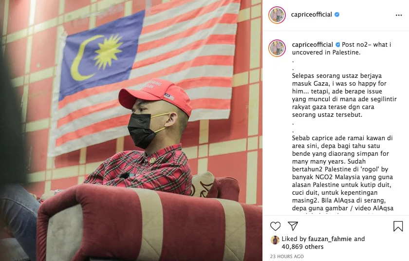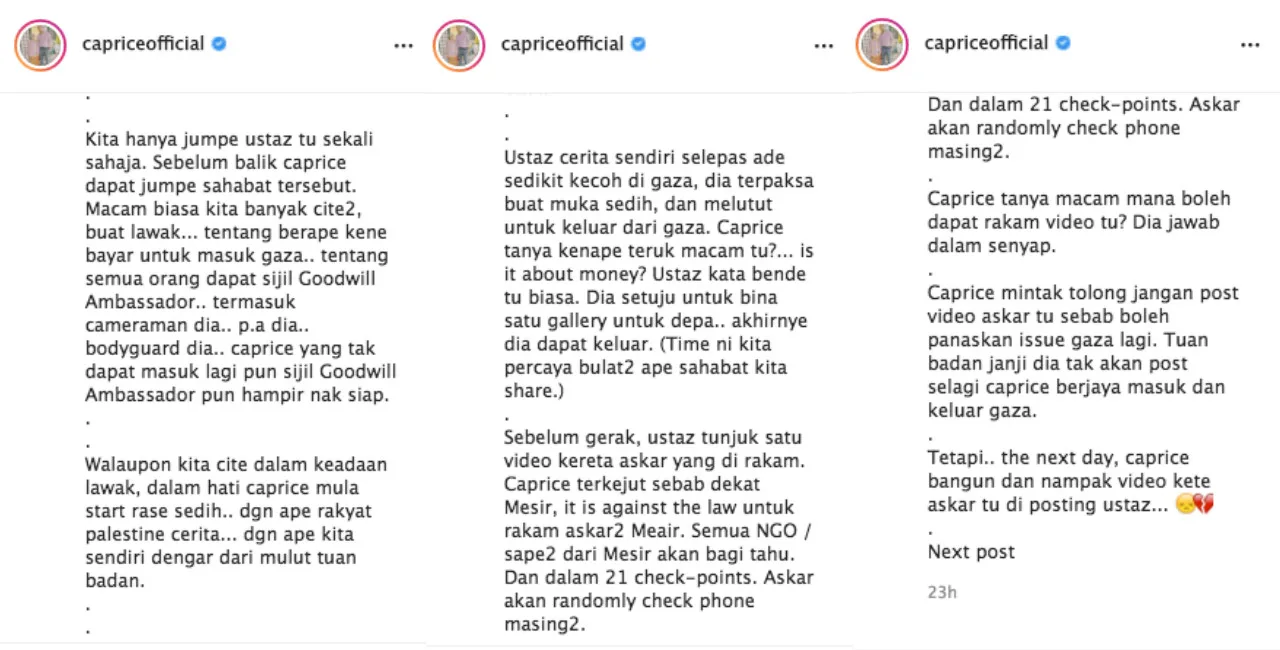 “After the ustaz revealed that he had entered Gaza, I was so happy for him,” Caprice wrote on his next post. “But, there were a few issues that occurred, where a few Gaza people said that they were offended by his approach.”