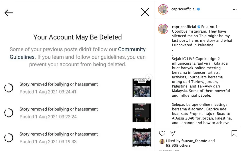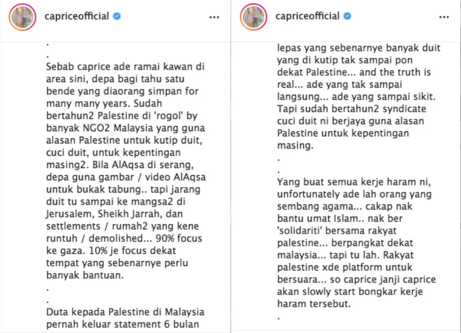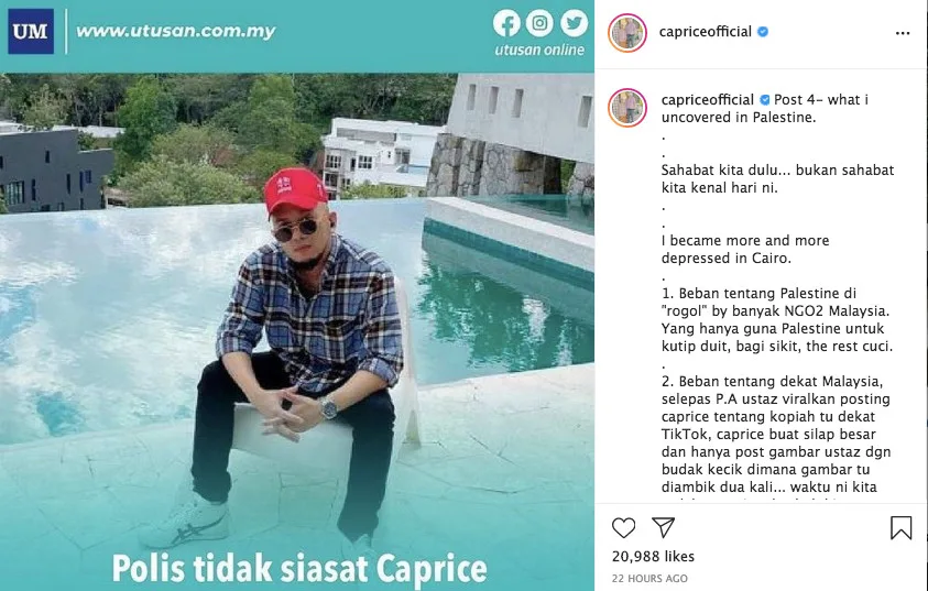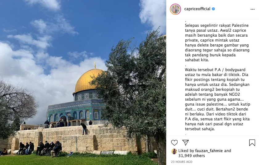 In his next IG update, Caprice also appeared to shed some light on his bad blood with a popular religious figure. “Despite few Palestinians questioning about the ustaz, I still had positive thoughts about it, so I privately asked the ustaz to just delete a few pictures, so they won’t look down on our friends.”
