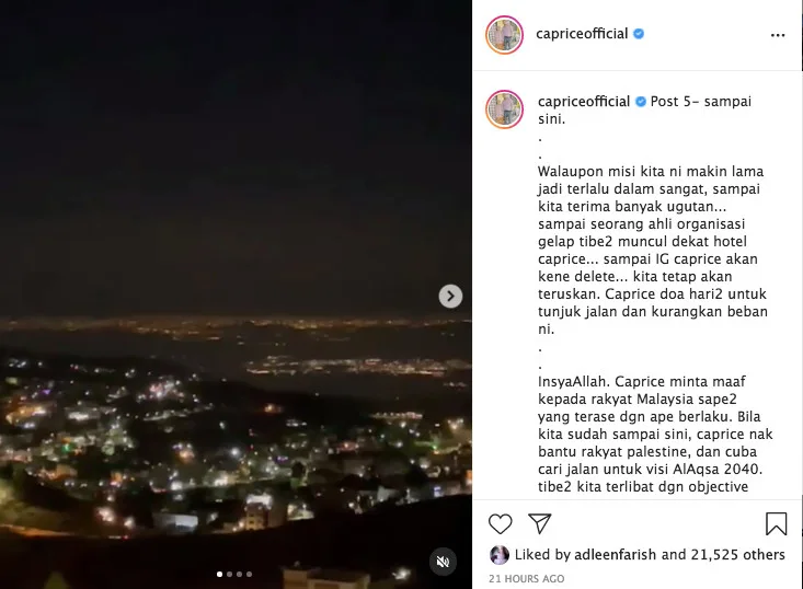 Caprice (real name Ariz Ramli) opened his post by recounting how he was initially able to travel to Gaza after his IG Live session with two Israeli influencers went viral. “We conducted many online meetings with influencers, artists, activists, journalists with people from Turkey, Jordan, Palestine, and Tel-Aviv from Malaysia. Some of them powerful and influential people,” he shared.