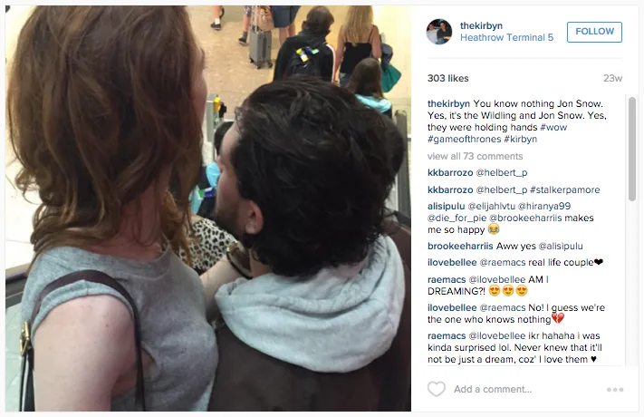 This wasn’t the first time that Kit and Rose were spotted together. In addition to the weekend excursion, they were also seen together at LAX, along with fellow “Game of Thrones” co-star Sophie Turner (Sansa Stark). Prior to that, a fan spotted them in August 2015 at Heathrow Airport in London, and even took a picture to prove it: