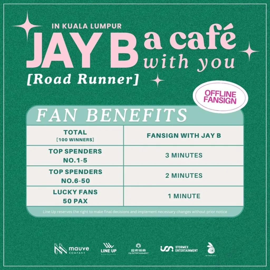 In the meantime, tickets for the singer’s first solo concert in KL have gone live via ticketmelon.com! The singer will perform at Zepp Kuala Lumpur on 27th April 2025 (Sunday) at 6pm. Ticket prices range from RM378 (T3) to RM1,290 (VVIP), and there are also exclusive fan benefits for all ticket holders. Jay B has promised an exciting show for all his adoring fans, so you won’t want to miss out! For an even better experience, here are the details for his fan sign event: