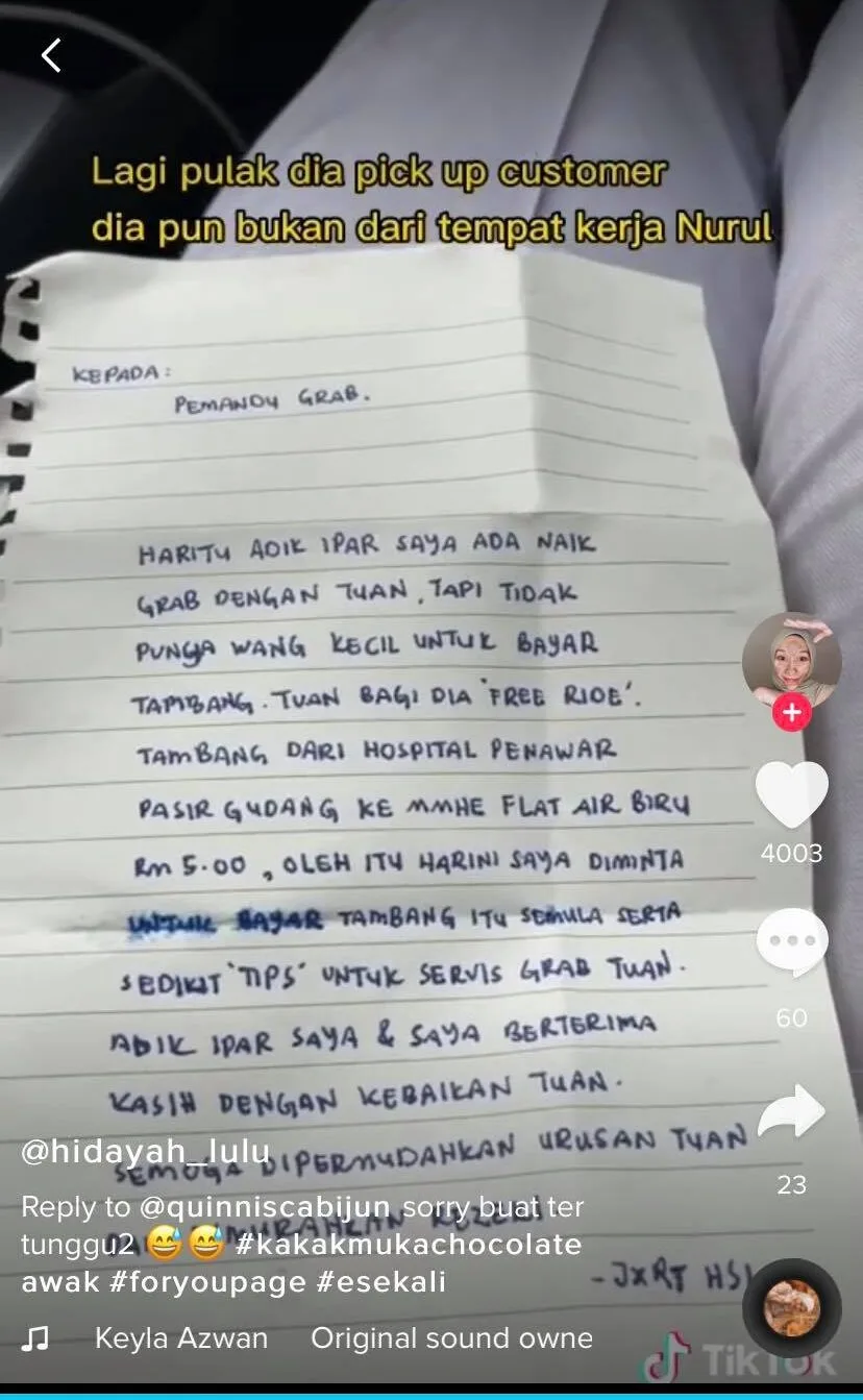 The famous quote comes to mind when we heard about the story involving a Grab Car driver, as shared by his wife, Nurul Abdul Rahman on her TikTok @hidayah.lulu.