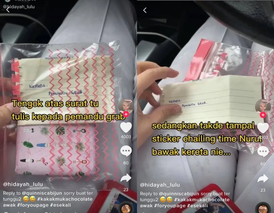 According to Nurul, she was initially surprised when she came across a plastic envelope containing a piece of hand-written note that was addressed to the Grab Driver. She said, “I was nervous all of a sudden. I thought maybe someone had sent a love letter to my husband.”