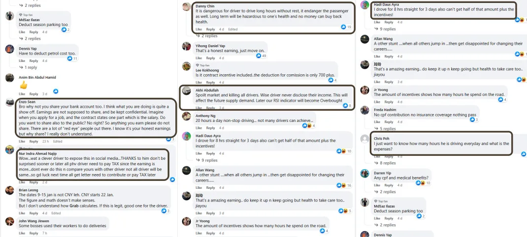The post was flooded with plenty of mixed responses from netizens. Most of them were debating on whether it was right for the driver to publicly share his earnings. Some of the comments include:
