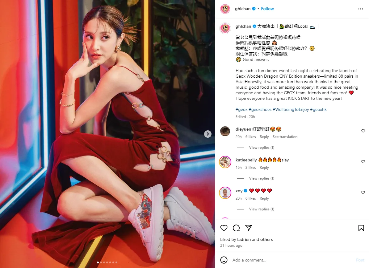 Just yesterday (10th January), Grace Chan uploaded footage of herself attending a dinner event for the launch of the Geox Wooden Dragon CNY Edition sneakers. Her photos and videos showed her in a tight, red dress wearing said shoes. “Boldly showing off the “Dragon Shoes Look”!” she captioned.